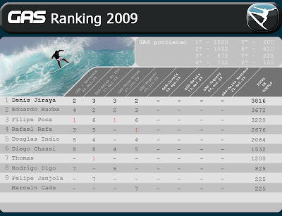 Mais uma vez o banbino Filipe Poca ergue a taça do circuito GAS 2009, encerrada neste domingo (7/6) em Barra do Una, São Sebastião (SP). Para conquistar o título ele empatou com sul-africano Eduardo Barba em 5.50 pontos na grande final do evento. Foram usados dois critériosde desempate para sair o vencedor. 1º soma-se apenas a melhor onda, mesmo assim empataram. 2º Soma-se as três melhores ondas. Poca somou mais um 1,0 e Barba não somou uma terceira onda.
